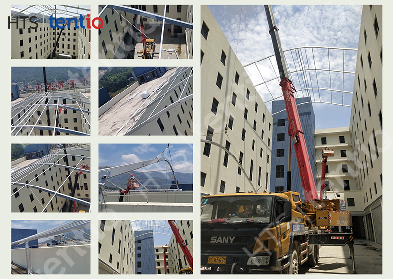 華燁裝配式體育篷房生產的主打便捷、快速、定制化、靈活性、重復利用等優勢。可利用城市中不同的閑置地形,哪怕是廢棄的樓頂都能建成一座體育場館,平均1天5000平方搭建速度,等待裝修進場完工后,即可快速投入使用。